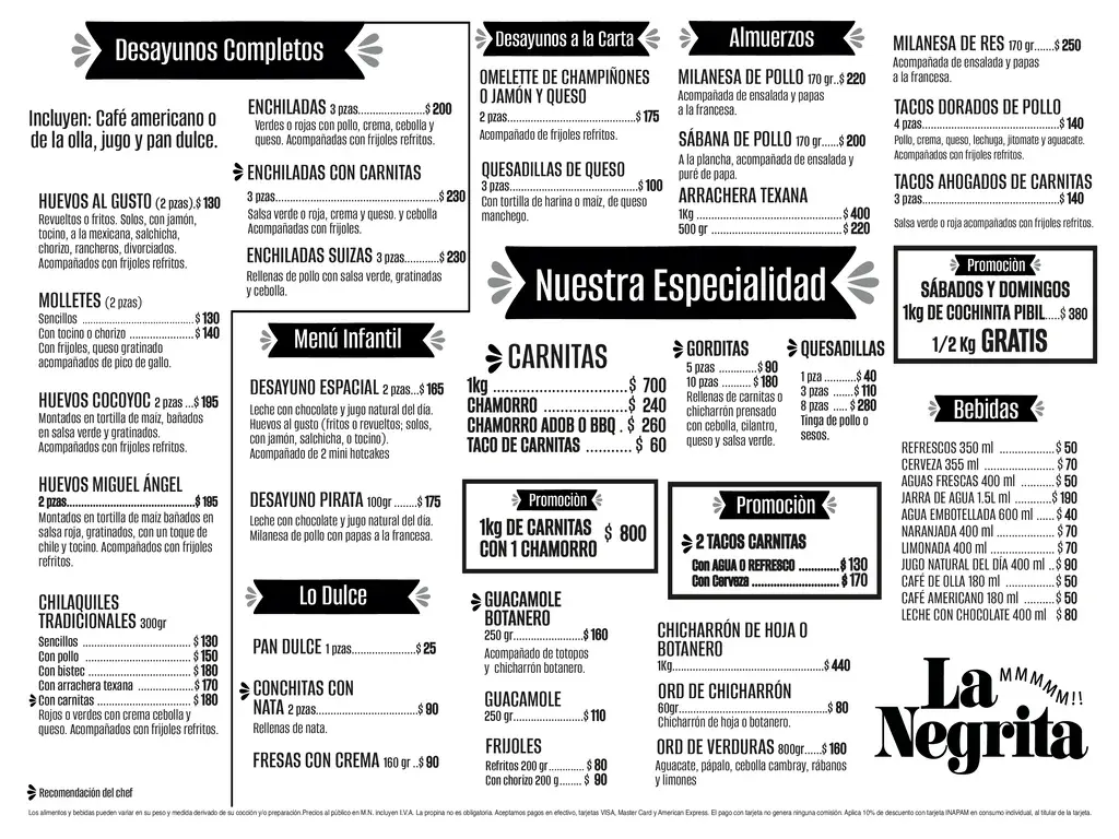En la Negrita usted puede degustar nuestra gran variedad de platillos mexicanos como, "Las mejores Carnitas del Mundo", contando con productos tales como Chicharron, Gorditas, Arrachera, Mixiotes de Carnero acompañados de deliciosas salsas para que usted pueda disfrutar de la diversidad de todos nuestros productos.